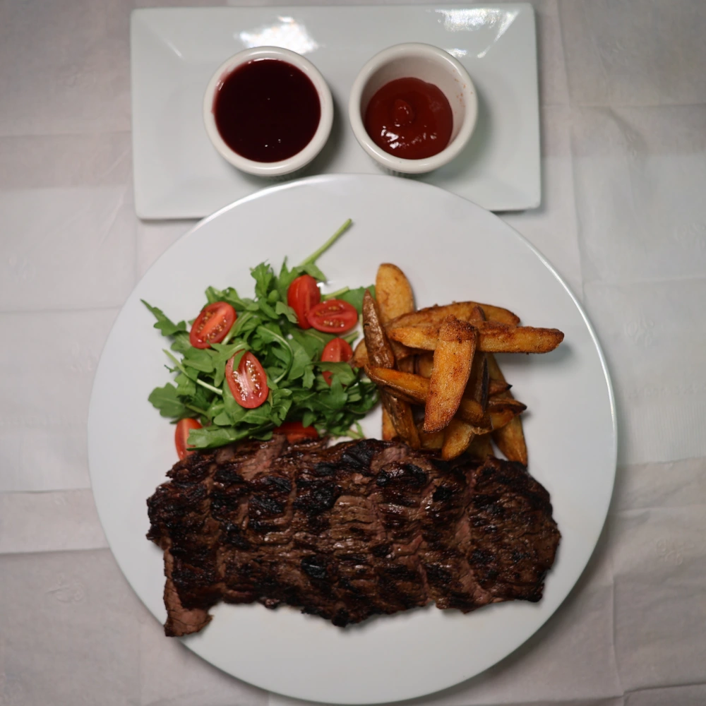 A juicy, flavorful New York strip, grilled to perfection and served with buttery mashed potatoes and seasonal veggies.